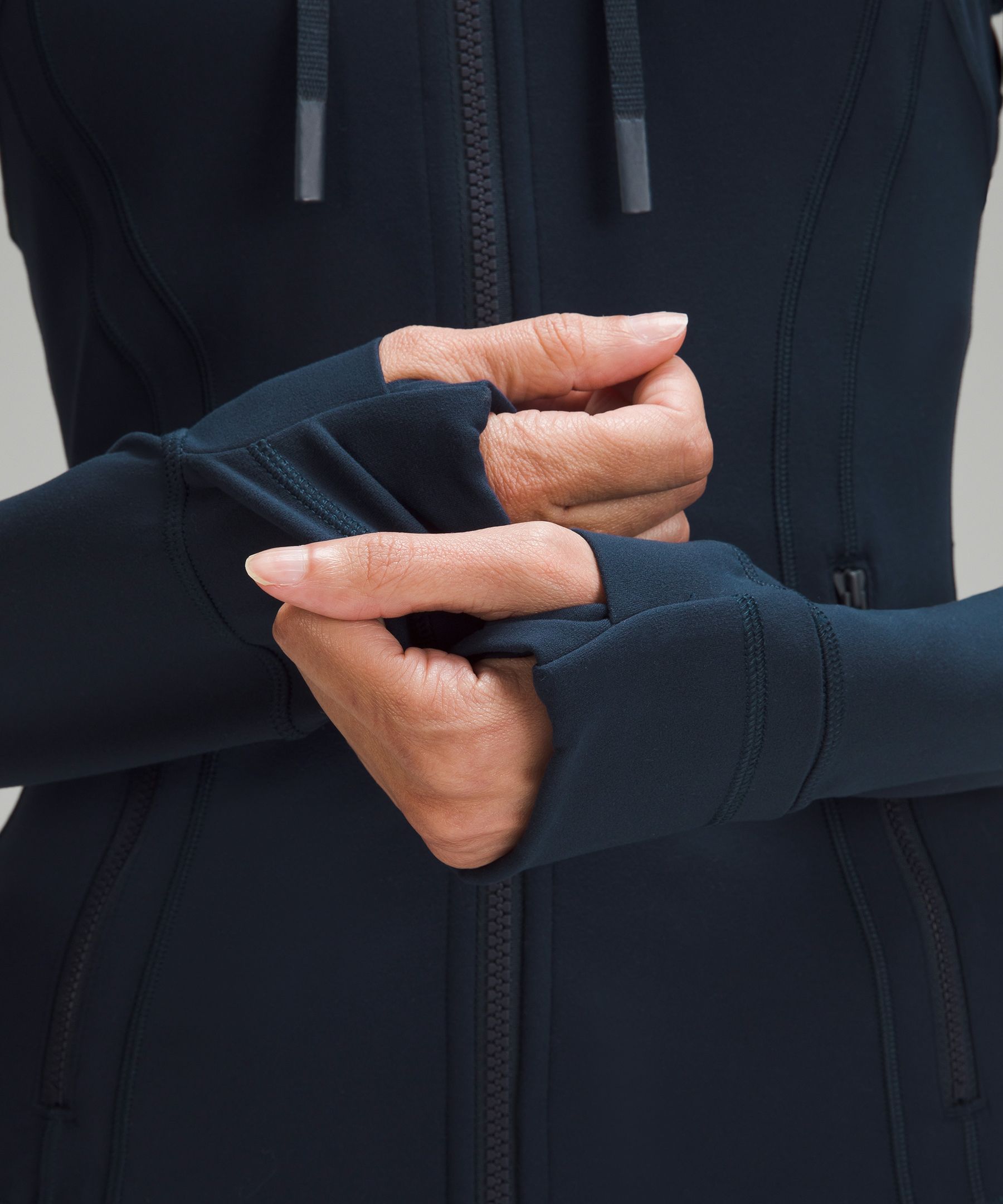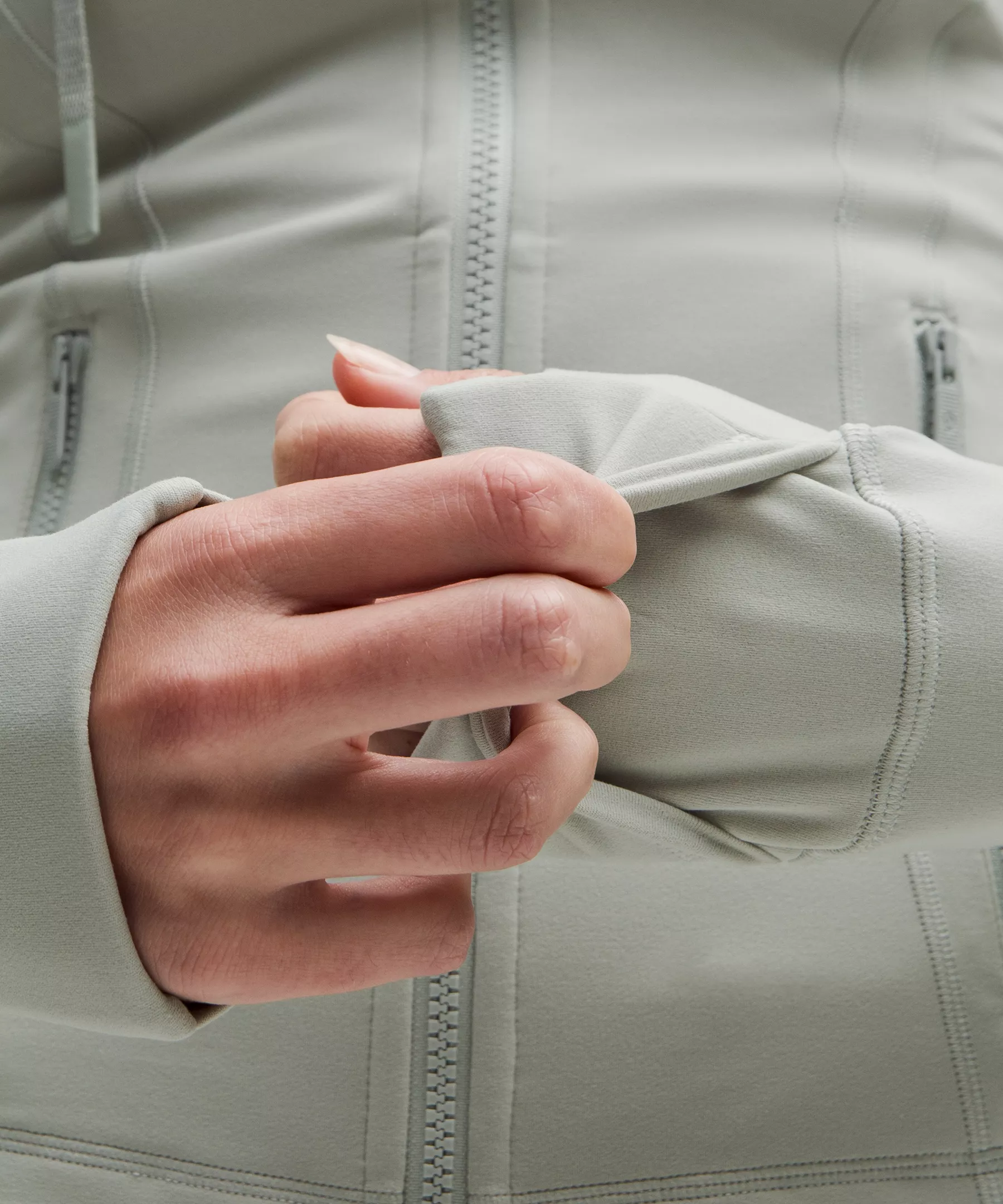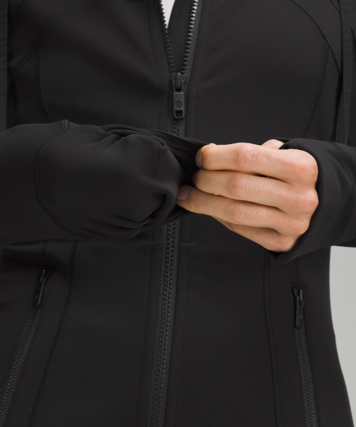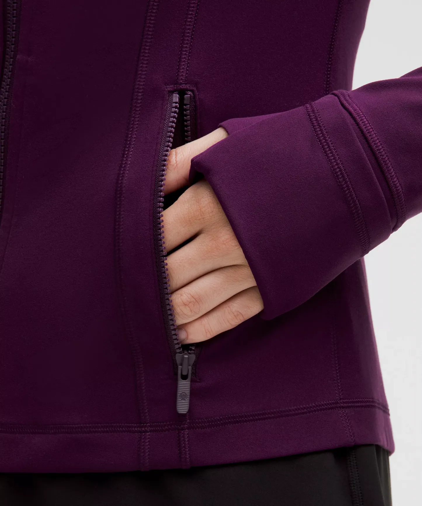 - Elastic zipper pull doubles as an emergency hair tie